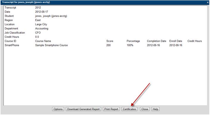 Once the transcript is displayed and a certificate is in force for the user, a Certificate button will appear on the bottom of the Transcript dialog.