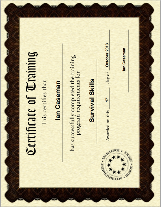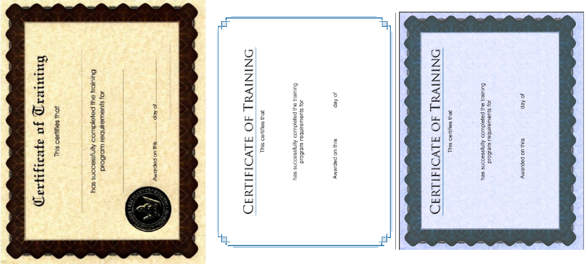 Below is a sample of the previous standard certificate (brown) that came with CourseMill 6x versions (CompCert.pdf). In Multi-language sites it will also be the CompCert_usa.pdf. Also shown is the new CM7 version (white) and an alternate (blue) if you are interested.