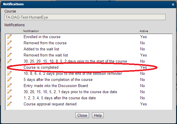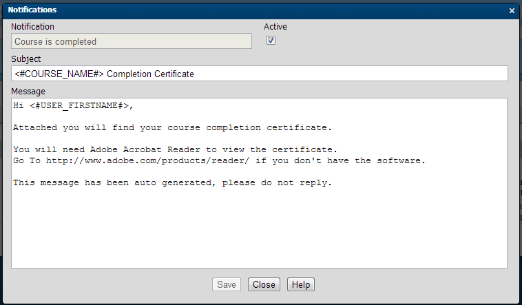Selecting the pencil icon for editing to the left of the Course is Completed notification will bring up the details of that notification. Be sure the Active check box is checked, as shown in the following example screen capture. The same can be done at the curriculum level.