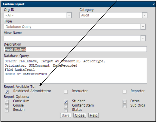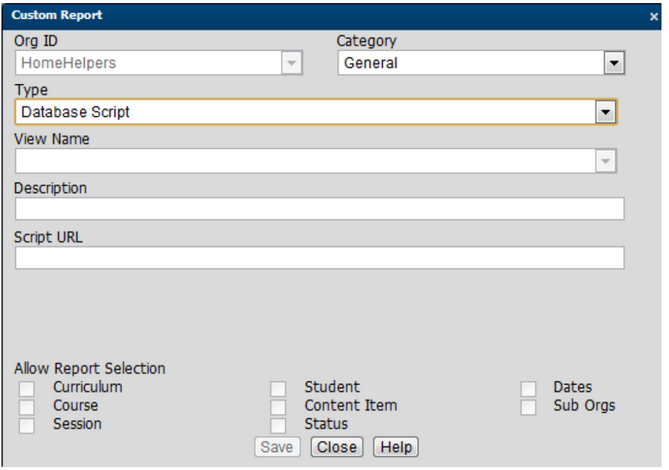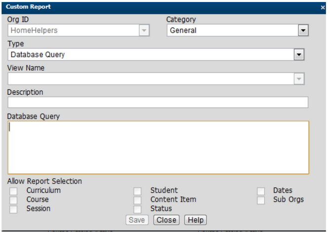 The report selection fields are enabled if you include in the select fields the corresponding column keys or they are enabled as part of the conditional where clause of the query. The Status option is enabled if you include either StudentCourse.Status or Sco.Lession_Status. The Dates option is enabled if you include any of the following: Student.LastLogin, StudentCourse.LastAccess, StudentCourse.CompletionDate, CourseSession.StartDate, or CourseSession.EndDate. |