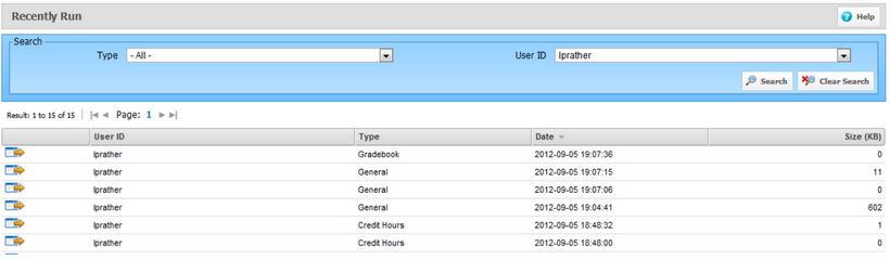 This selection is simply a list of recently run reports that were processed by an organization or a particular user. This feature is only available to administrators to audit the reporting performance of the system. For example, if a large report is running every day that is affecting performance, you might want to schedule it to run at night.