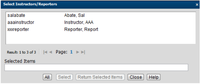 Click Select to view what Instructors/Reporters are available to choose from and the following screen will allow you to choose and return selected items to then save: