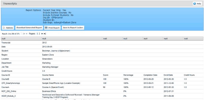 The Transcripts report provides a number of summary transcripts all in one report. It can provide a view of the history of all students to see what courses were taken, what scores they received, how long it took them to complete each course, and more.