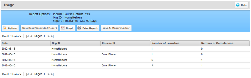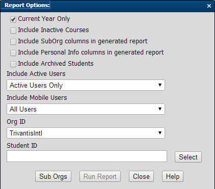 The Usage reports provide information on the number of logins, number of launches, and number of completions in the organization. This is only available to administrators. Selecting the Options button will bring up the Reports Options pop-up window: