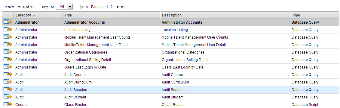 With CourseMill, there are approximately 47 standard reports providing a foundation for extracting system data. These general reports are not typically your daily operational reports. They are more static reports and used when setting up the system or diagnosing a problem. The SQL statements that make up these general reports can be copied and pasted as a starting point if you are trying to create a new Custom Report.. Many of these general reports have been re-created in our new Advanced Reports giving you many more options for creating and changing reports. If you have access to the Advanced Reporting module, we strongly suggest you use that tool for reporting.