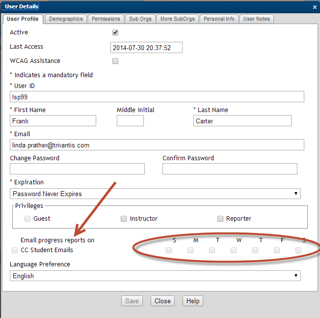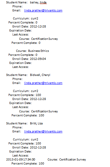 Progress Reports are also available to reporters. These can be set up to be automatically sent to them based on the selection that is chosen in the reporter’s user profile as shown below. A sample of a progress report that is emailed out is shown on the next page. We recommend not using this report as it is probably the first one ever developed in CourseMill and is not very “friendly”. The only reason to possibly use this is that, today, it drives two other notifications to the managers: Evaluations and Approvals. If you are not using either one, we suggest not using Progress Reports.