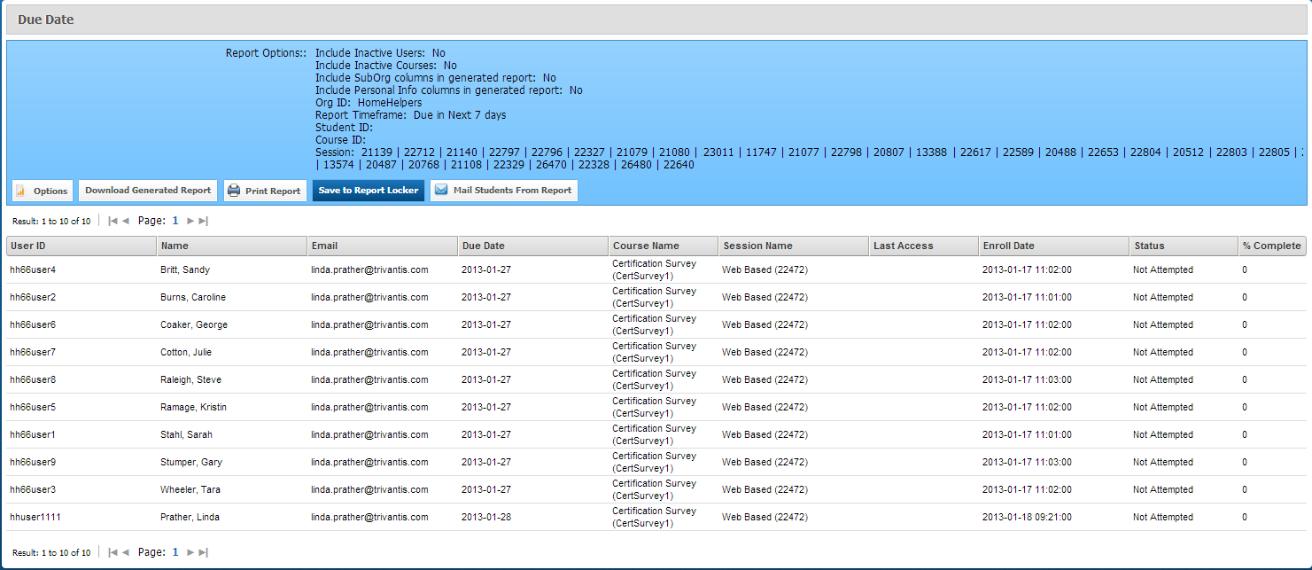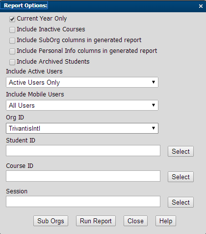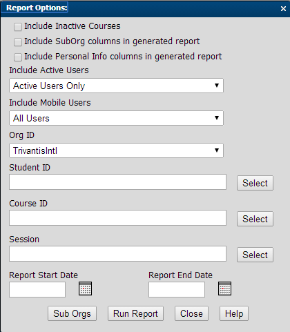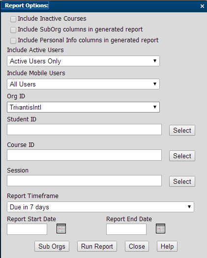 Due Date Report Parameters Check or uncheck the Inactive Users/Courses boxes to switch between the different data displays formats. Select one, or a combination of parameters, to enable the Run Report button. The Due Date report selection provides the ability to select one or more level options (student, course, session, and/or report timeframe) and start and end dates to narrow the report down to your specific needs. Select whether or not you wish to see the Sub-Orgs and/or the Personal Info columns on the report. |