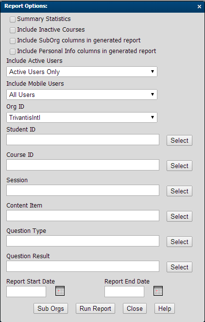 Interactions Report Parameters Check or uncheck the Summary Statistics box to switch between the two different data displays formats. Select one, or a combination of parameters, to enable the Run Report button. The Interactions selection provides the ability to select one or more level options (student, course, session, question information, and content item) to narrow the report down to your specific needs. You can also select start and end dates to narrow your selection. Select whether or not you wish to see the Sub-Orgs and/or the Personal Info columns on the report. Requires that test-question interactions are included (SCORM or AICC) when courses are published. Lectora will provide these using the Publish to CourseMill option. |