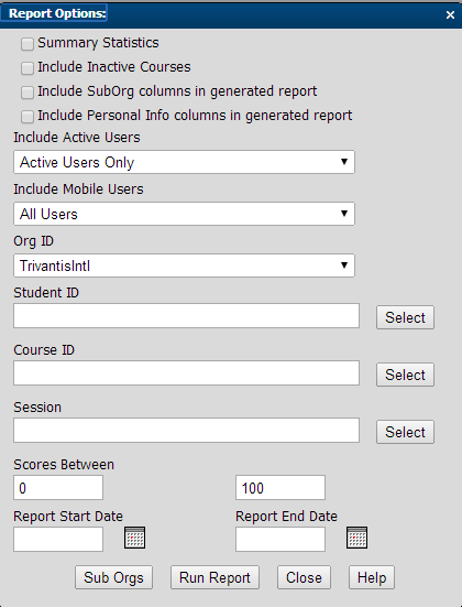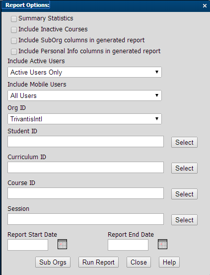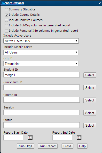 Status Report Parameters Check or uncheck the Summary Statistics box to switch between the two different data displays formats. Select one, or a combination of parameters, to enable the Run Report button. The Status selection provides the ability to select one, or more level options (student, curriculum, course, and/or session) and start and end dates to narrow the report down to your specific needs. Select whether or not you want to see the Sub-Orgs and/or the Personal Info columns on the report. |