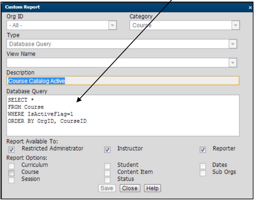 Custom reports can be downloaded or saved for quick retrieval or for automatic scheduling in the Report Locker. Many times you can copy and paste the SQL statements from one report and use that code in your newly created custom report. To see the code in any General report:
