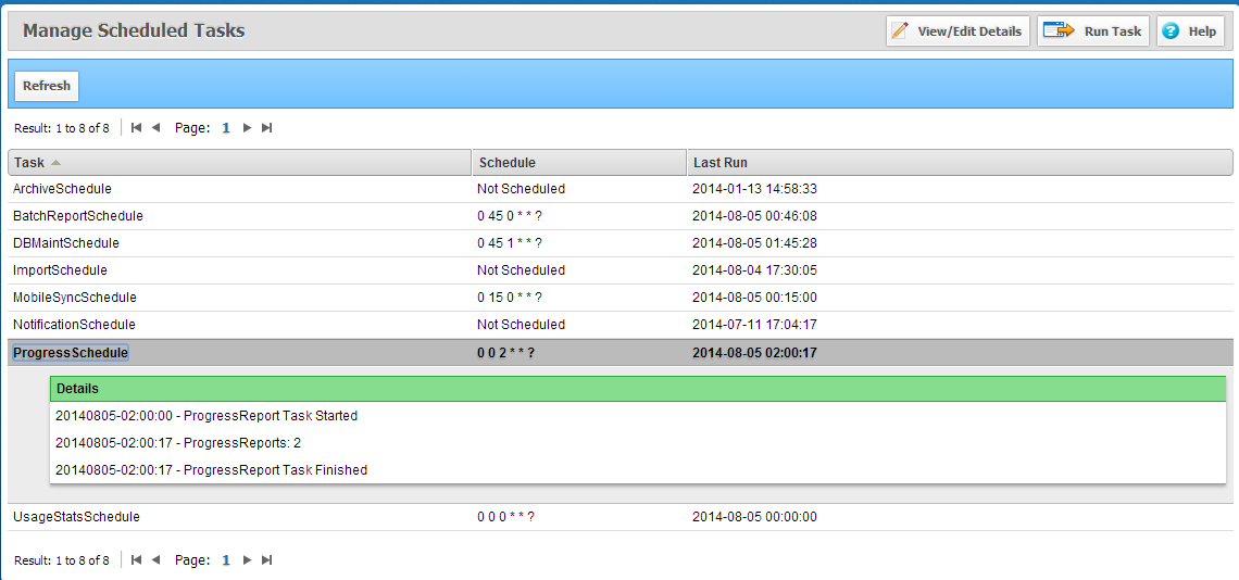 | These reports are generated on an automatic schedule as your administrator defines in the Manage Scheduled Task option as shown at right. |