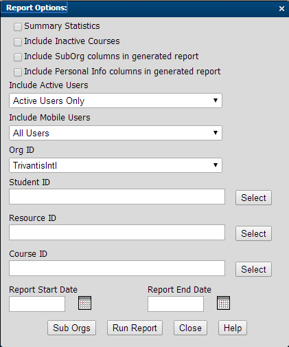 Resources Report Parameters Check or uncheck the Summary Statistics box to switch between the two different data displays formats. Select one or a combination of parameters to enable the Run Report button. The Resources Report selection provides the ability to select one or more level options (student, resource, course, and/or sub-orgs) and start and end dates to narrow the report down to your specific needs. Select whether or not you want to see the Sub-Orgs and/or the Personal Info columns on the report. |